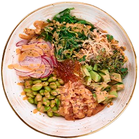 Чиращи боул с лососем авокадо, лосось, морские водоросли, редис, красная икра, эдамаме, крабовое мясо, салатный микс